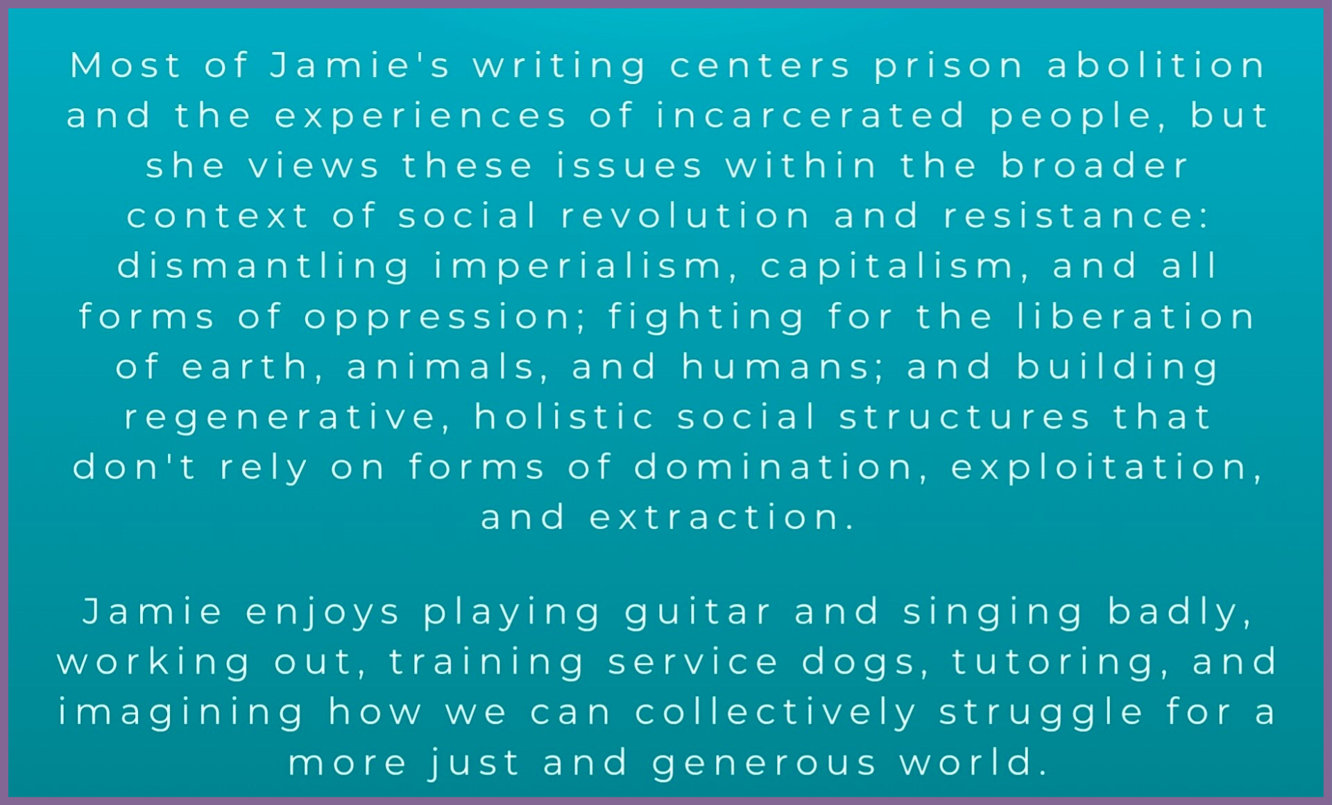 JS: Only recently have I started to experiment with form, as well as more long-form poems and sequences. I find it funny how I used to dismiss form as constrictive and outdated, because I've since fallen in love! Recently, I've written a sestina, a crown of sonnets, a couple of ghazals, and I'm currently working on a heroic crown, which is definitely a challenge! I've been adhering to rhyme schemes for both the crown of sonnets and the heroic crown, which I've discovered is forcing my brain to think in different ways. I love it! I'm always eager to learn and challenge myself as a writer. I believe that poetry and art in general are incredible instruments for activism; they help us to build community, connect with people who are different from ourselves, and collectively imagine a better world. In my opinion, poetry has a unique ability to foster empathy in comparison to other mediums. Reading a poem allows you to feel what the speaker is feeling, even if you and the speaker have completely different identities, values, and life experiences. The act of both reading and writing poetry is transformative. As someone who is deeply interested in the contradictions of human nature, I believe that poetry forces us to see beyond the good/bad binary. Poems are an attempt to order and ascribe meaning to chaotic, complex, and confusing forces. As a result, they can help us better understand ourselves and each other. I also think poetry has the power to help us actually feel our feelings, to remain tethered to a place of compassion and empathy, to resist the urge to numb ourselves. As a result of numerous factors including my past trauma, my consumption of news media, and the daily violence of prison, I believe that I have been desensitized to suffering. And this is unacceptable. Poetry helps me resist my survival instinct to numb myself by forcing me to confront and feel my emotions. In this way, I believe that poems can help us be more empathetic beings.